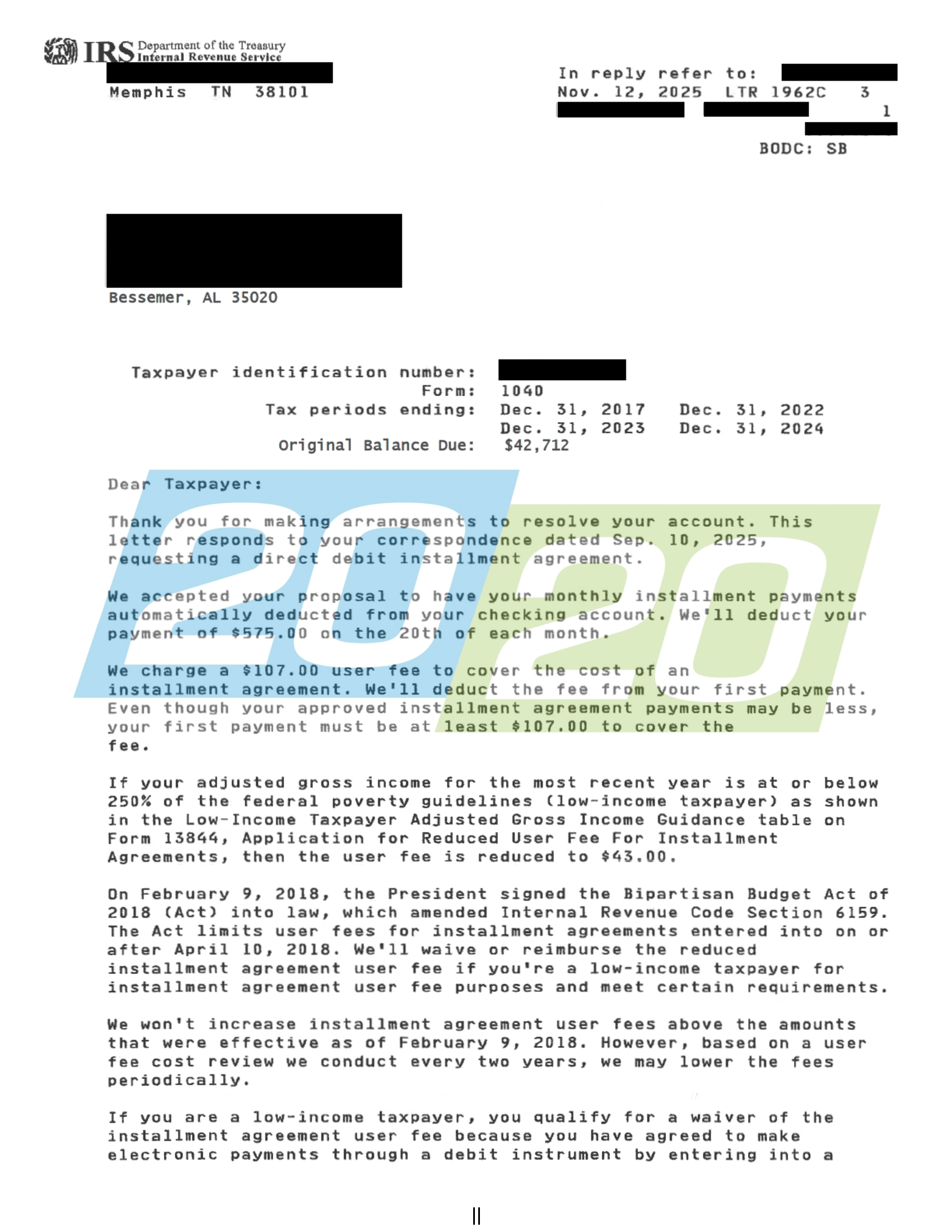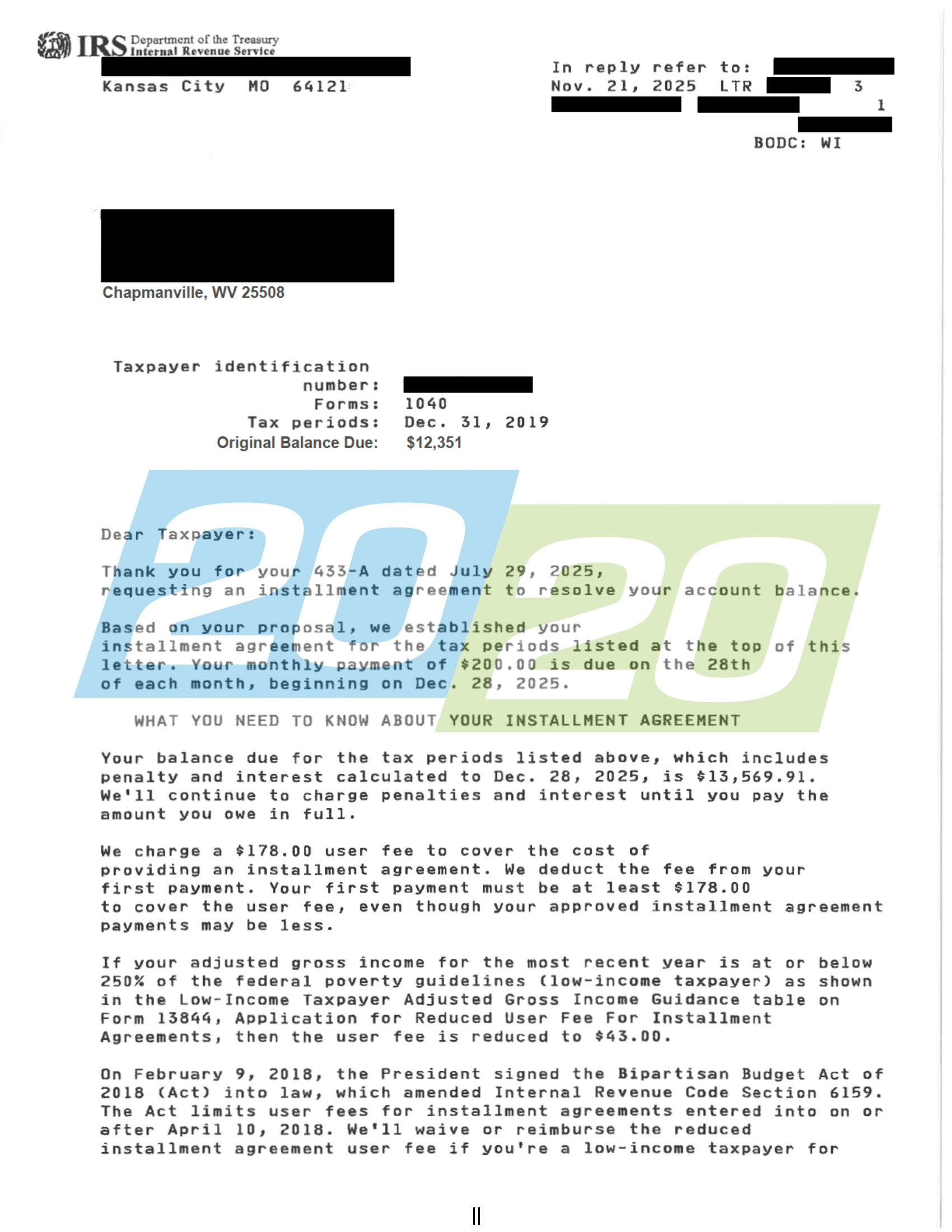20/20 Tax Resolution was successful in their negotiations of an Internal Revenue Service payment agreement for a client in Riverside, California. 20/20 Tax Resolution negotiated payments of $600 monthly on a liability totaling over $19,000. Please click the thumbnail to the right for more details.