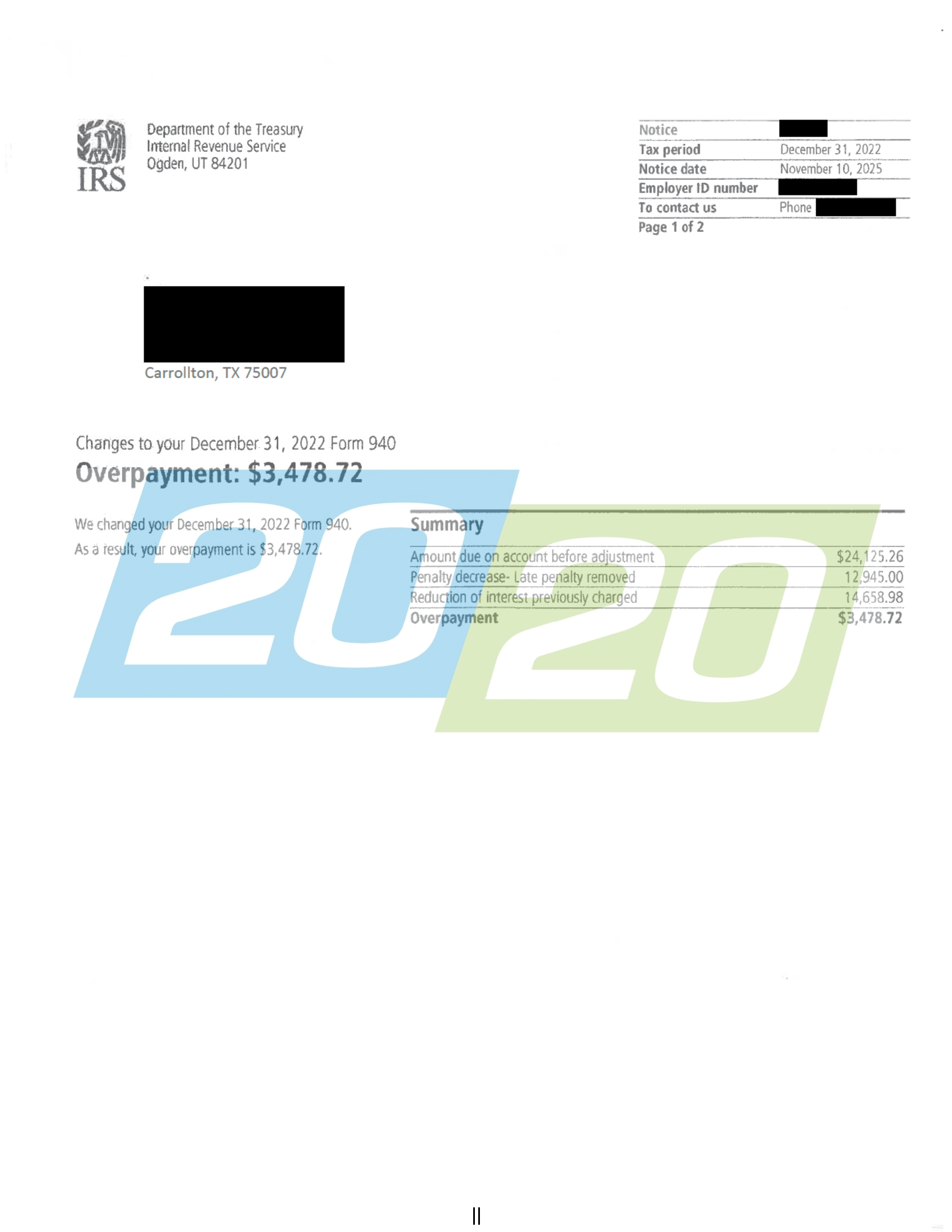 20/20 Tax Resolution successfully negotiated a Penalty Abatement with the IRS for a client in Manchester, Tennessee. This client owed over $96,000 in back taxes and had over $96,000 waived. Please click the thumbnail to the right for more details.